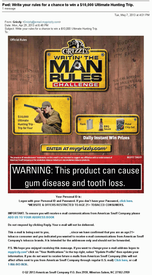Email from Grizzly received in April 2013 promoting their "Writin' the Man Rules Challenge." The email features images and description of prizes including a $10,000 hunting trip for four. The email invites the receiver to enter the sweepstakes at mygrizzly.com.