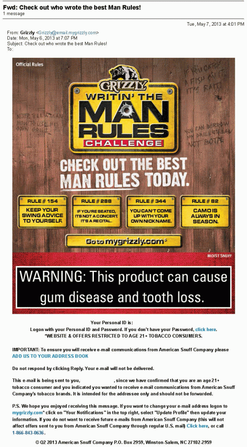 Email from Grizzly received in May 2013 promoting their "Writin' the Man Rules Challenge." The email features the best "man rules" submitted by participants for the sweepstakes, and invites the receiver to the website. Text: "Check out the best man rules today."