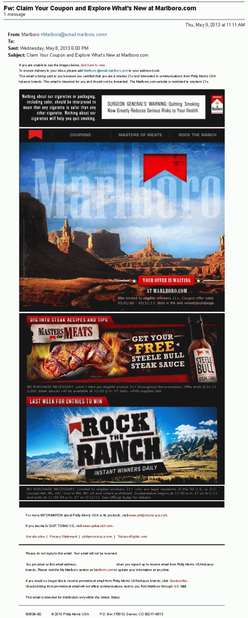 Email from Marlboro received in May 2013 inviting the receiver to Marlboro.com to claim an offer; offering steak recipes and a free bottle of bbq sauce; and promoting the last week of the Rock the Ranch instant win sweepstakes.