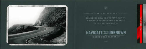 Direct mail piece from Marlboro received in May 2013 promoting their Marlboro Black product line. The piece includes two coupons (only stubs included); one for regular Marlboro Black cigarettes, and another for Marlboro NXT Regular to Menthol, which is similar to Camel\\\'s Crush product. Text: \\\"True West; bound by sea and storied earth, a wild land beckons the bold into the unknown. Navigate the unknown, where bold flavor is.\\\"