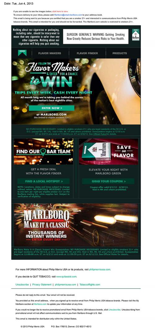 Marlboro email received in June 2013 promoting their Follow the Flavor Makers sweepstakes. Email invites receiver to enter the sweepstakes, find a local "Flavor Maker" or collect coupons.