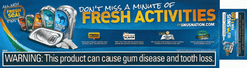 Direct mail from Camel Snus promoting it\\\'s website and encouraging the receiver to go to Snusnation.com and participate in the many social networking activities offered. Text: \\\"Don\\\'t miss a minute of fresh activities at Snusnation.com.\\\"
