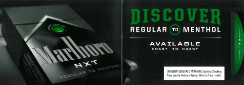 Direct mail received from Marlboro promoting their NXT product, part of the Marlboro Black line. The piece has a clean, granite finish, with a coupon tucked inside a pocket for the receiver to pull out. NXT is a special product features a menthol, pressure-release capsule in its filter, similar to Camel Crush. Text: "Discover regular to menthol available coast to coast."