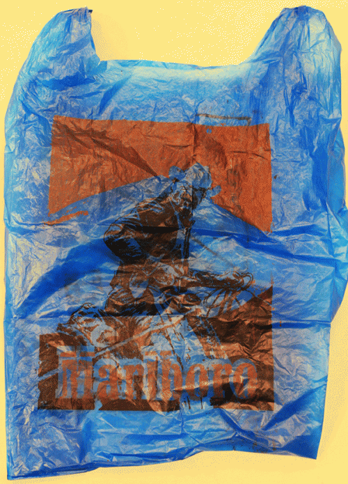 Plastic bag with Marlboro advertising received by Trinkets in July 2013. The bag comes from a hotel in Moshi, Tanzania in Africa. It was used by the hotel to deliver everything from laundry to lunches. The bag features in image of a cowboy on a horse as well as the brand name.