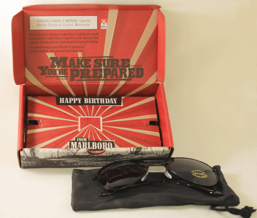 Sunglasses received from Marlboro as a Birthday gift. The sunglasses come secured in a cardboard box, with the carrying pouch below. This gift was received by Trinkets twice in different boxes, one with the Marlboro Green (menthol) theme, the other, Marlboro Red. Text: \"Out here a Birthday lasts until sunup. Make sure you\'re prepared. Happy Birthday from Marlboro.\"