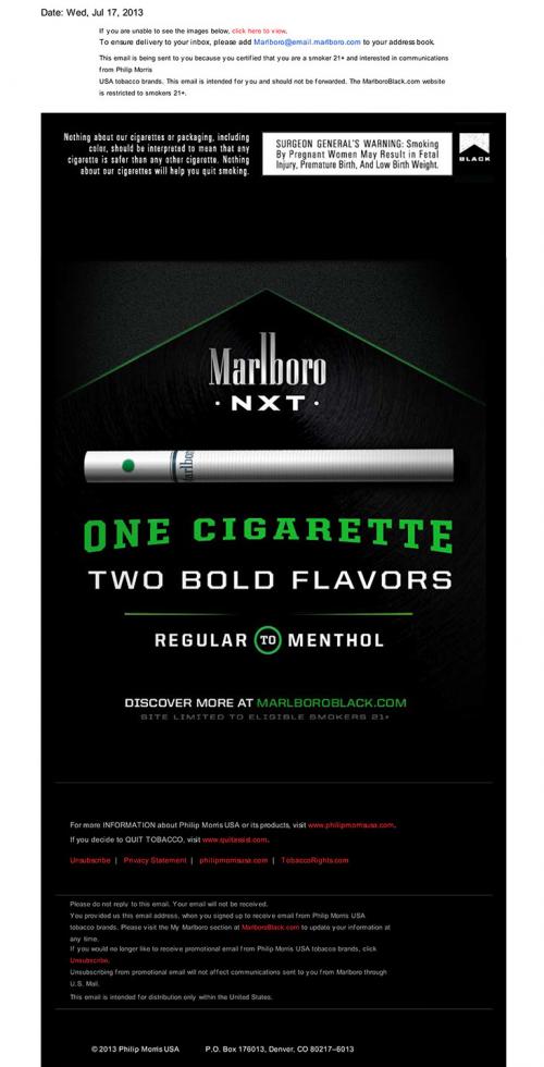 Marlboro email received in July 2013 promoting Marlboro NXT. Email contains a link to the website to learn more information about the product.