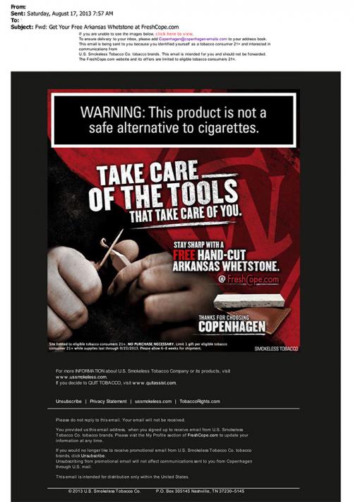 Email from Copenhagen received August 2013 advertising a gift offer for a Hand-Cut Arkansas Whetstone. Receivers can redeem the whetstone offer by visiting the brand's website. Text: "Take Care Of The Tools That Take Care Of You."