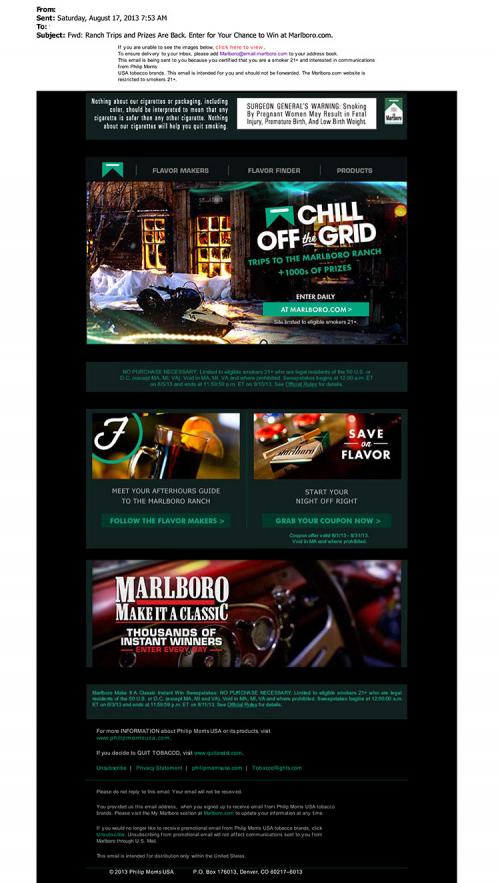 Marlboro email received August 2013 inviting the receiver to visit Marlboro.com to have access to coupons, the flavor makers website feature, and the ability to enter the "Chill Off the Grid and "Marlboro Make It A Classic" sweepstakes.