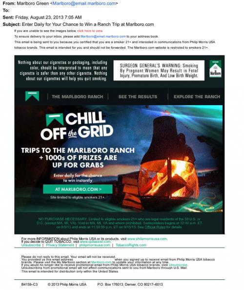 Email received from Marlboro in August 2013 promoting their Chill Off the Grid sweepstakes. The email invites recipients to visit the website in order to enter daily to win prizes and a trip to the marlboro ranch.