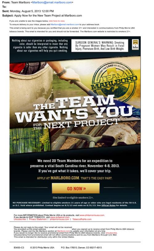 receiver to join the project by visiting the Marlboro website . Text: "The Team Wants You For The Next Project."