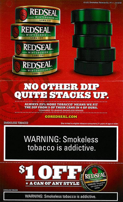 Direct mail piece from Red Seal received in September 2013 advertising how "No other dip quite stacks up." Piece states that Red Seal offers 25% more tobacco, which means they are able to fit the dip from 5 cans into 4 Red Seal cans. The piece includes a coupon for $1.00 off a can of any Red Seal style.