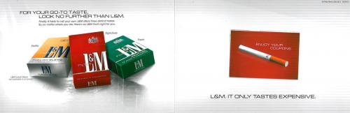 Direct mail piece received from L&M in June 2013 delivering the coupons the recipient requested online. The piece features pictures of their available products and a border of various images that surround the L&M logo, which is actually the back of the attached coupon booklet. Text: "L&M. It Only Tastes Expensive."
