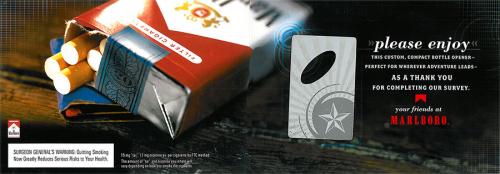 Direct mail piece from Marlboro containing a custom and compact bottle opener. The piece was sent to the consumer as a "thank you" for filling them in by completing their survey.