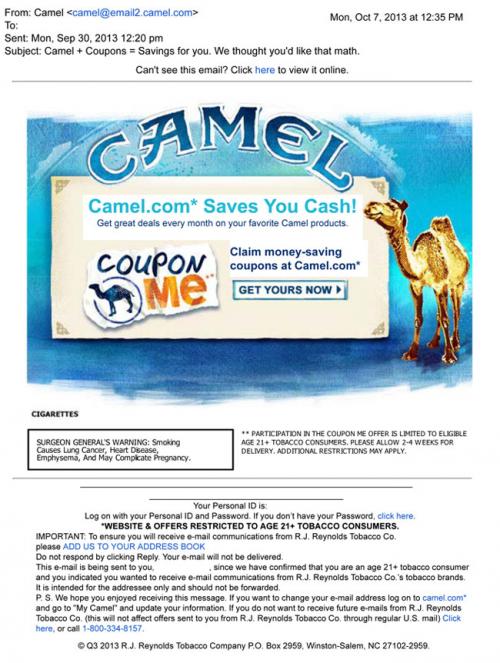 emails from Camel. The email received from Camel in October 2013 is inviting the receiver to visit camel.com in order to claim money-saving coupons. Text: "Camel.com Saves You Cash!"