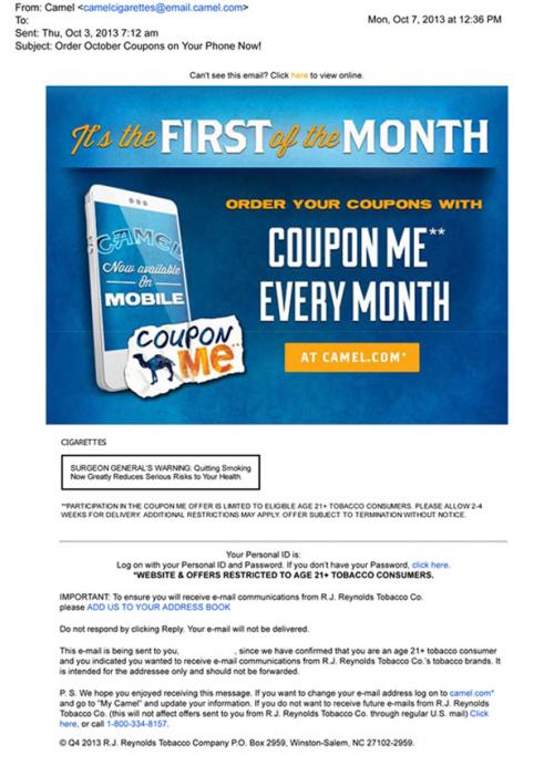emails from Camel.The email received in October 2013 is informing the receiver that now their mobile device can be used to order a camel coupon every month. Text:"It's the First of the Month."