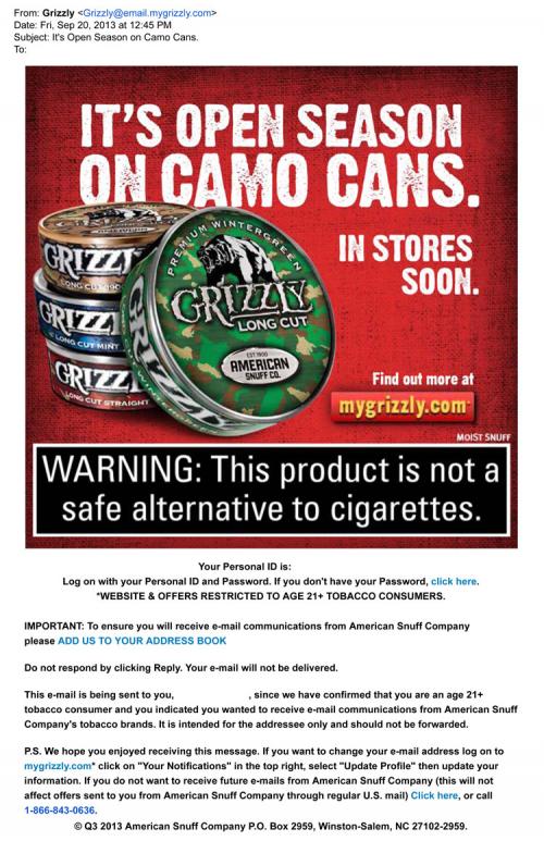 Email received from Grizzly in September 2013 promoting their new camo product tins that will be in stores soon. Text: "It's open season on camo cans."