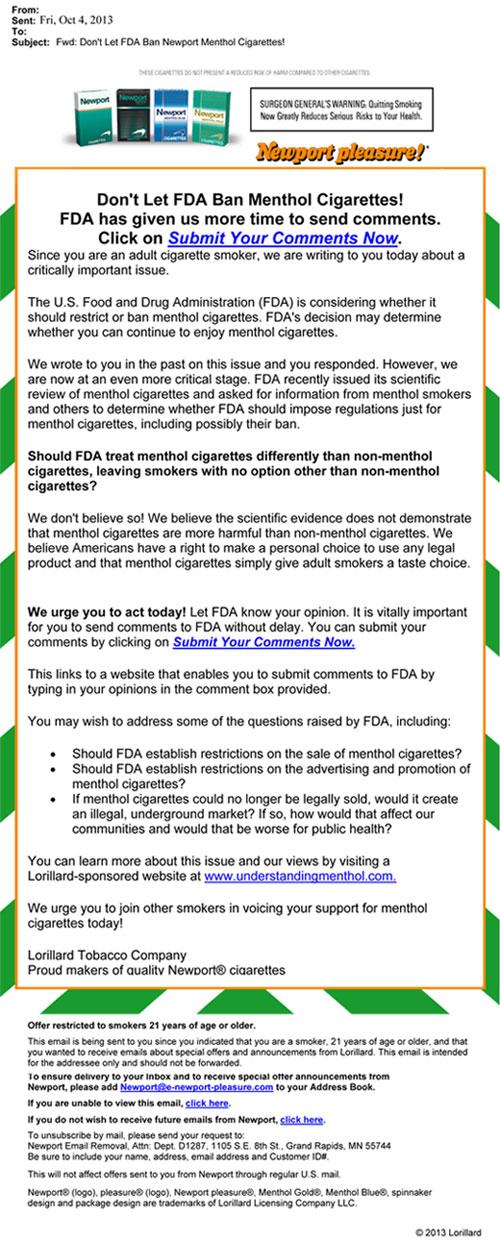 Email received from Newport in October 2013 informing the receiver the FDA has extend the deadline to send in comments about whether the FDA should restrict or ban menthol cigarettes. The email encourages
