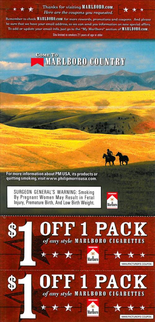 with the coupons that were requested from marlboro.com. Text: "Come to Marlboro Country."