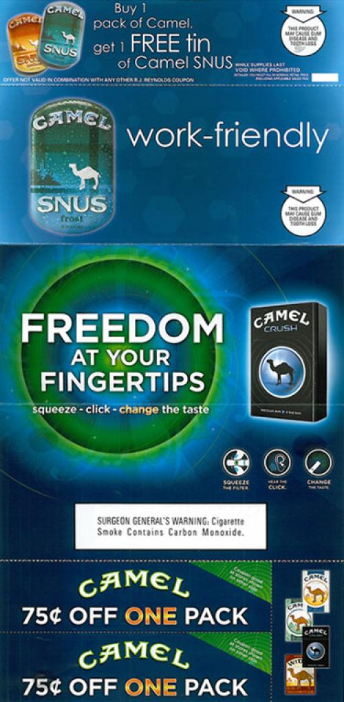coupon for a free tin when purchasing one pack of Camel cigarettes. This