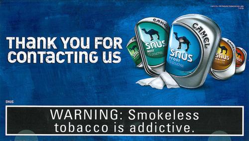 Direct mail peice from Camel Snus received in November 2013 thanking the receiver for contacting them. The piece includes a short letter addressed to the receiver from the Camel Customer Care Team. The piece includes 3 coupons for a 'get one tin of Camel Snus for $1.00'.