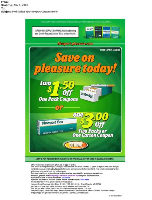 Email received from Newport in November 2013 inviting the recipient to the brand's website in order to chose which coupon they want to have access to this month. Text: "Save on pleasure today."