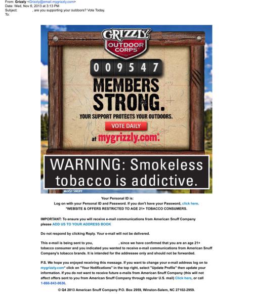 Email received from Grizzly in November 2013 encouraging the receiver to visit the brand's website and vote daily in the Grizzly Outdoor Corps contest with the other 9,547 members who support protecting the outdoors.