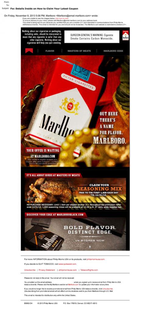 Email received from Marlboro in November 2013 encouraging the receiver to visit Marlboro.com in order to not only claim their coupon, but also claim Masters of Meat seasoning mix, and also learn more about Marlboro's newest cigarette, Marlboro Edge.