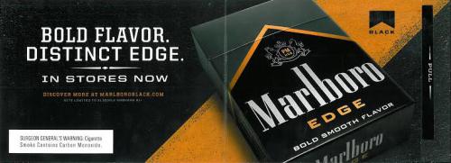 Direct mail piece received from Marlboro in November 2013 introducing the new Marlboro Edge cigarette. Piece includes two coupons; both for $2.00 off a pack of Marlboro Edge. Text "Welcome to Marlboro Edge" "Bold Flavor. Distinct Edge. In stores now."