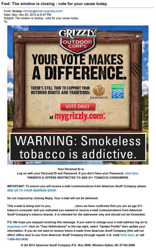 Email received from Grizzly in November 2013 encouraging the receiver to visit the brand website and vote daily in the Grizzly Outdoor Corps contest.Text: "Your vote makes a difference. There's still time to support your outdoor rights and traditions."