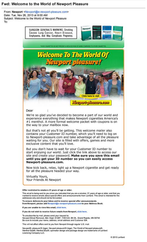 Email received from Newport in November 2013 informing the receiver that not only is their welcome packet is on its way, but that the receiver can still have access to the brand's website by clicking the link in the email and creating a password.