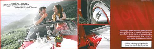 Direct mail piece from L&M received in November 2013 delivering coupons the receiver requested on their website. The piece includes a picture of a couple eating lunch on a car in the mountains with a pack of L&M cigarettes, as well as a picture of two packs of L&M cigarettes. Text: "Another great way to wow your taste. L&M. It only tastes expensive."