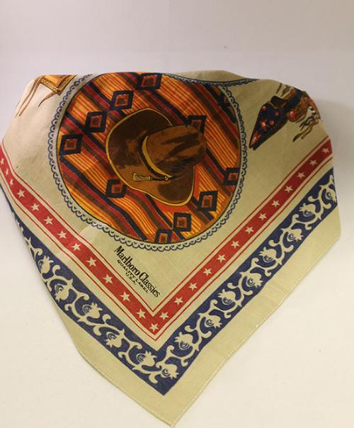 Piece is a bandana made by Marlboro that is cowboy themed. The piece was bought at the Marlboro Classics store at the World Conference on Tobacco in 2006.