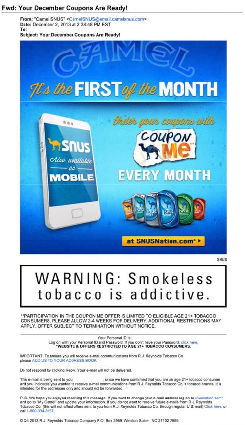 Email received from Camel Snus in December 2013 inviting the receiver to the brand's website to claim this month's coupons. Text: "It's the First of the Month."