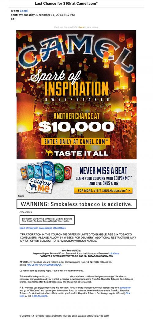 E-mail from Camel received in December 2013 reminding the receiver to enter daily into the Camel "Spark of Inspiration" sweepstakes online. At the bottom of the e-mail, there is also a "coupon me" logo reminding users to claim their coupons with "coupon me" and to give Camel Snus a try at SnusNation.com Text: "Camel Spark of Inspiration Sweepstakes. Another Chance at $10,000. Enter daily at camel.com"
