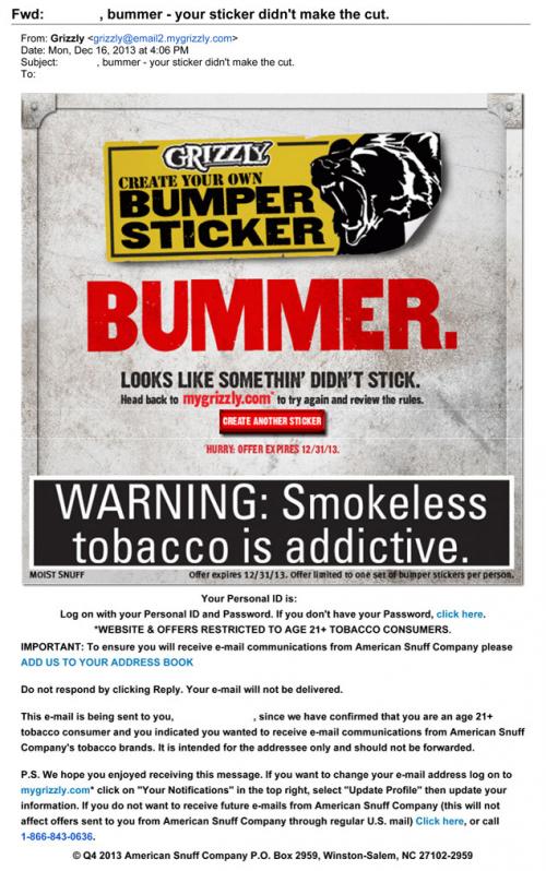 Email received from Grizzly in December 2013 inviting the recipient to the brand's website for another try at creating their own bumper sticker. Text: "Bummer. Looks like somethin' didn't stick."
