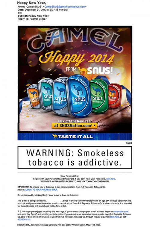 E-mail received from Camel Snus about two hours before midnight on New Year's Eve 2013. E-mail wishes the user a "Happy 2014 from Camel Snus" and invites users to kick off the new year at snusnation.com.