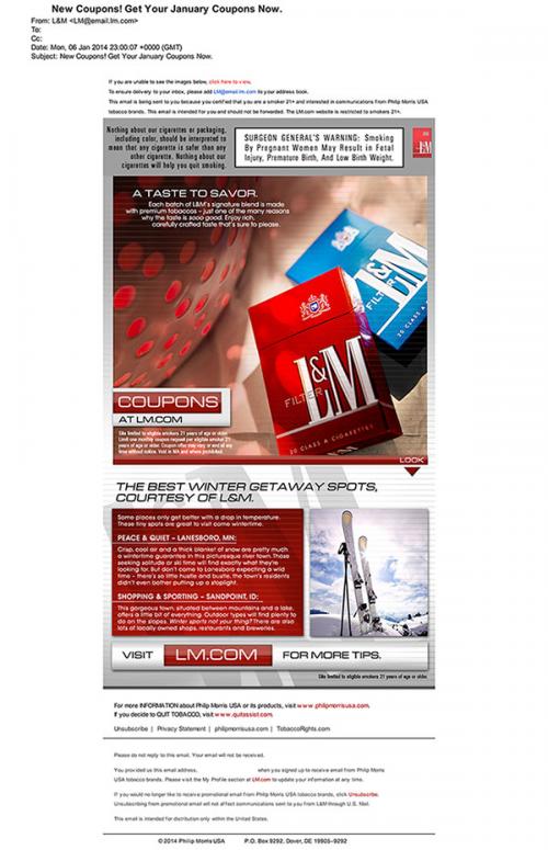 E-mail received in January 2014 from L&M inviting the receiver to visit LM.com for coupons. E-mail also suggests two winter getaway spots - one in Lanesboro, MN and the other in Sandpoint, ID. Text: "A taste to savor. Each batch of L&M's signature blend is made with premium tobaccos - just one of the many reasons why the tase is sooo good. Enjoy rich, carefully crafted taste that's sure to please." "The best winter getaway spots, courtesy of L&M. Some places only get better with a drop in temperature. These tiny spots are great to visit come wintertime."