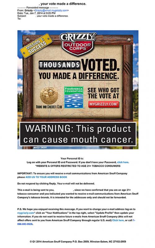 Email from Grizzly received in January 2014 stating that the receiver's vote of which outdoor foundation should win a donation from Grizzly Outdoor Corps has made a difference. The email gives the two top foundations, and invites the receiver to visit their website to see which foundation got the most votes.