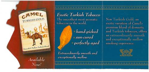 Point of sale booklet promoting new Camel Turkish Gold, Smooth & Mellow product. The small fold-out booklet features information on the product including its "extraordinarily smooth and exceptionally mellow" taste. The product is also promoted as an "exotic variation of Camel's premium blend of domestic and Turkish tobaccos," and "the smoothest most aromatic tobaccos in the world."