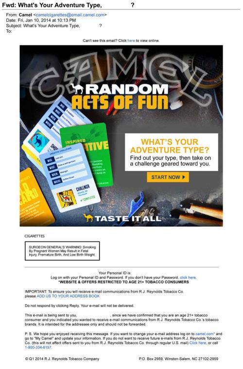 Email received from Camel in January 2014 inviting the recipient to the brand's website in order to play a game called random acts of fun. In this online game, the recipient answers question to find out what adventure type they are and then they complete the challenge given to them based on their adventure type.