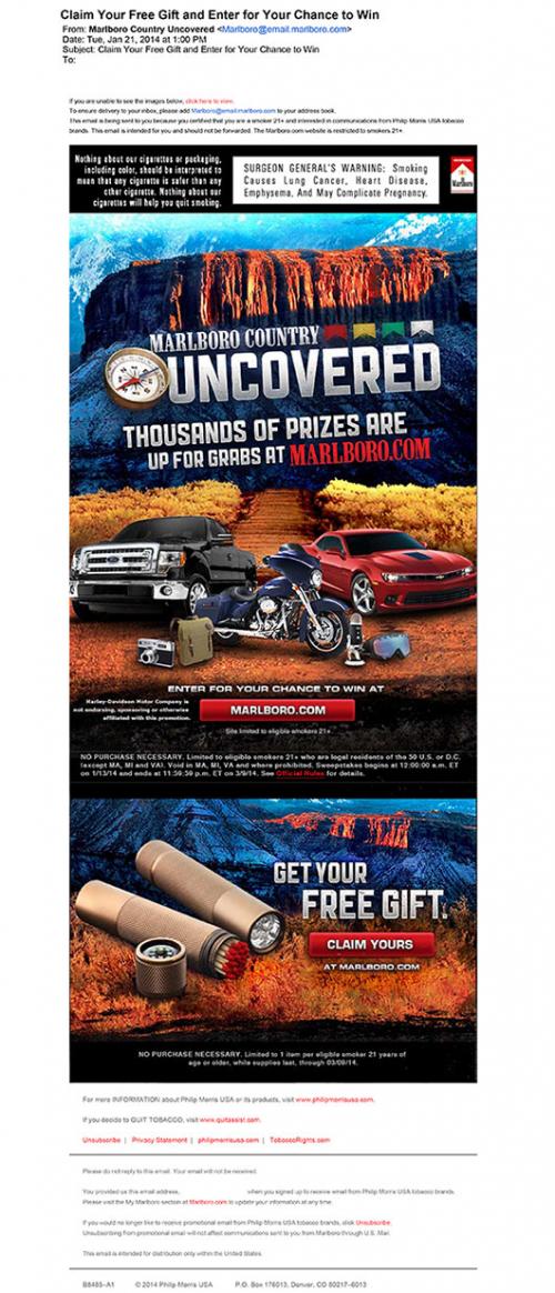 Direct mail from Marlboro received on January 21, 2014 adveritising \"Marlboro County Uncovered\", and thousands of prizes of for grabs on the brand\'s website. The email also invites the user to visit the website to claim a free flashlight/matchbook.