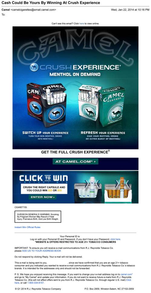 Email received from Camel in January 2014 inviting the recipient to the brand's website to learn more about Camel Crush cigarettes as well as play a instant win game based on Camel Crush cigarettes. Text: "Camel Crush Experience. Menthol On Demand."