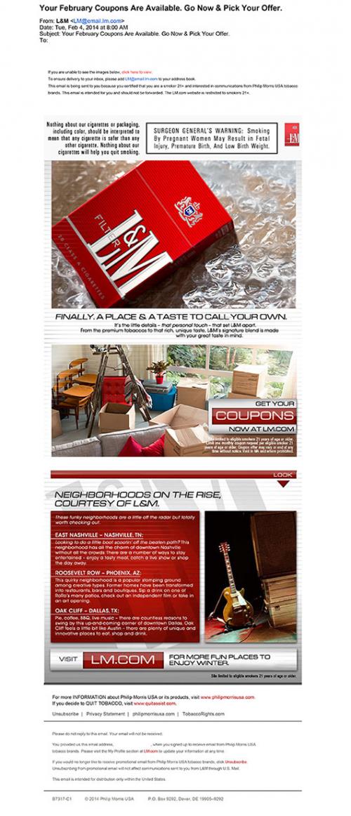 Email from L&M received February 4th, 2014 inviting the receiver to go on the brand's website to choose which coupon offer they would like to receive. The email also lists a few neighborhoods in the United States that are on the rise and should be checked out.