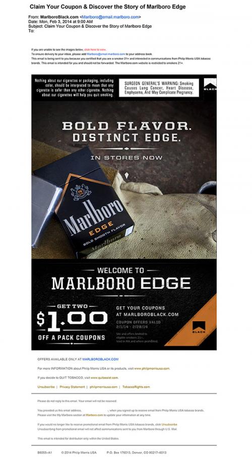 Direct mail from Marlboro received on February 3, 2014 advertising their new "Marlboro Edge" product in stores now. The mail invites the receiver to go to MarlboroBlack.com to get two $1 off a pack coupons. Text: "Bold Flavor. Distinct Edge. In stores now. Welcome to Marlboro Edge."