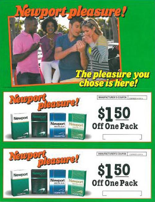 Newport direct mail piece received in February 2014 sending the receiver two coupons that were requested online at Newport-pleasure.com. Coupons are both for $1.50 off one pack. Text: "Newport pleasure! The pleasure you chose is here!"