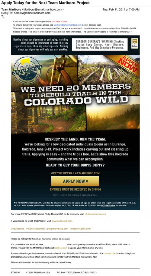 Email received from Marlboro in February 2014 inviting the recipient to apply to the newest Team Marlboro project to rebuild trails in the Colorado wild.