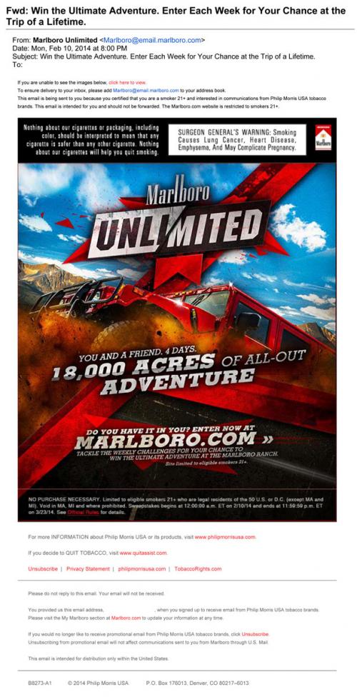 Email received from Marlboro in February 2014 inviting the recipient to the brand's website in order to enter Marlboro Unlimited Instant Win Game by answering their weekly challenge questions. Text: "You and a friend. 4 days. 18,000 acres of all-out adventure."