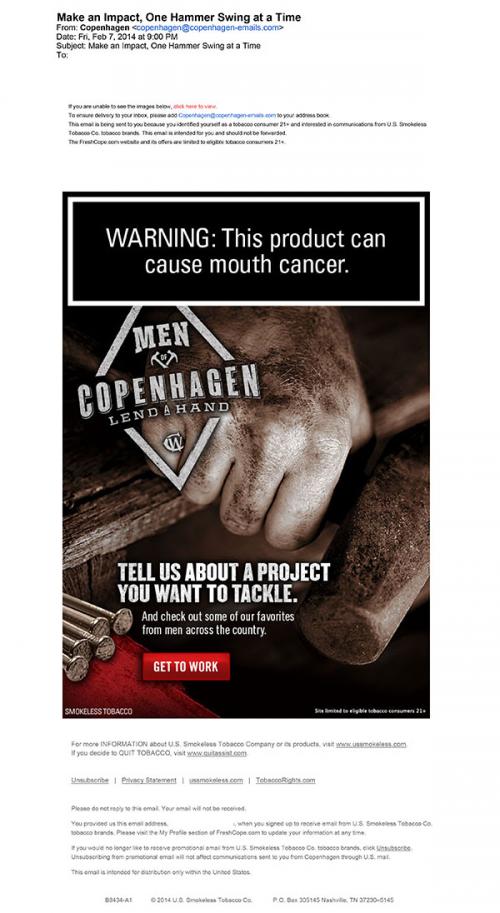 Email from Copenhagen received on February 7, 2014 inviting the receiver to tell them about a project they would like to tackle and to check out some of their favorite projects by clicking the "Get to Work" link located at the bottom of the email which brings the receiver to their website. Text: "Men of Copenhagen Lend a Hand."