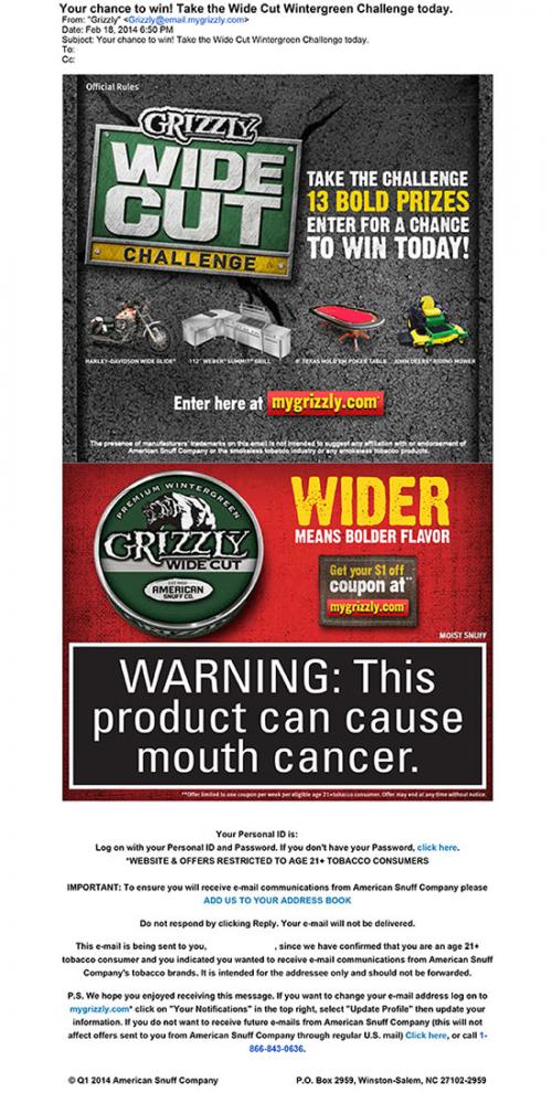 Email from Grizzly received on February 18, 2014 advertising their new Wide Cut Wintergreen product and their "Wide Cut Challenge." The receiver is invited to enter the challenge online for a chance to win one of 13 prizes. The receiver is also invited to visit the website for a $1 off coupon for Grizzly products. Text: "Take the Challenge. 13 Bold Prizes. Enter for a Chance to Win Today." "Wider means Bolder Flavor."