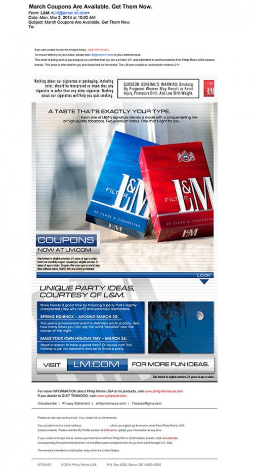 Email from L&M received on March 3, 2014 inviting the receiver to order coupons at LM.com. The email advertises L&M's signiture blends as "a taste that's exactly your type." The email also invites the receiver to the website for unique party ideas for two occasions: Spring Equinox around March 20 and "Make Your Own Holiday Day" on March 26.